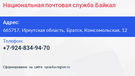 Национальная почтовая служба-Байкал по адресу 665717, Иркутская область, Братск, Комсомольская, 12 в дальнейшем Организация, размещена в следующих категориях: