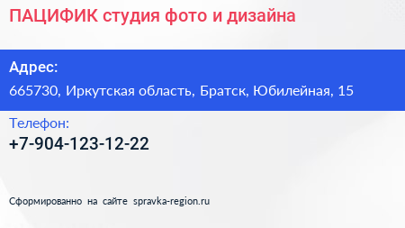 ПАЦИФИК, студия фото и дизайна по адресу 665730, Иркутская область, Братск, Юбилейная, 15 в дальнейшем Организация, размещена в следующих категориях: