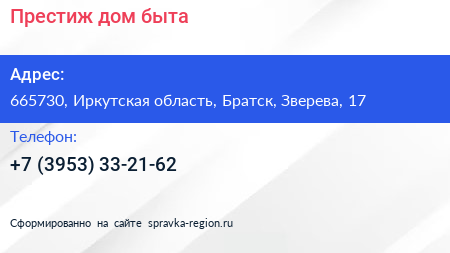 Престиж, дом быта по адресу 665730, Иркутская область, Братск, Зверева, 17 в дальнейшем Организация, размещена в следующих категориях:
