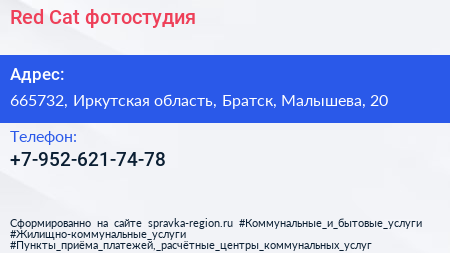 Red Cat, фотостудия по адресу 665732, Иркутская область, Братск, Малышева, 20 в дальнейшем Организация, размещена в следующих категориях: