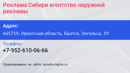 Реклама Сибири, агентство наружной рекламы по адресу 665719, Иркутская область, Братск, Энгельса, 19 в дальнейшем Организация, размещена в следующих категориях: