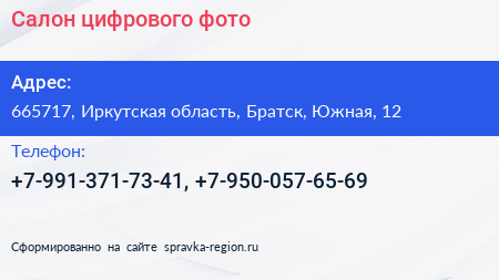 Салон цифрового фото по адресу 665717, Иркутская область, Братск, Южная, 12 в дальнейшем Организация, размещена в следующих категориях: