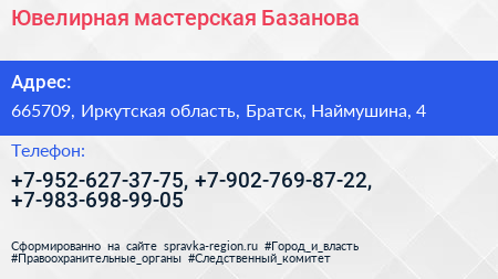 Ювелирная мастерская Базанова по адресу 665709, Иркутская область, Братск, Наймушина, 4 в дальнейшем Организация, размещена в следующих категориях: