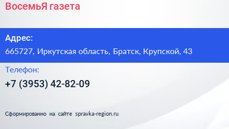 ВосемьЯ, газета по адресу 665727, Иркутская область, Братск, Крупской, 43 в дальнейшем Организация, размещена в следующих категориях: