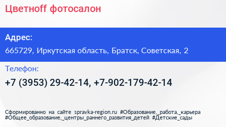 Цветноff, фотосалон по адресу 665729, Иркутская область, Братск, Советская, 2 в дальнейшем Организация, размещена в следующих категориях:
