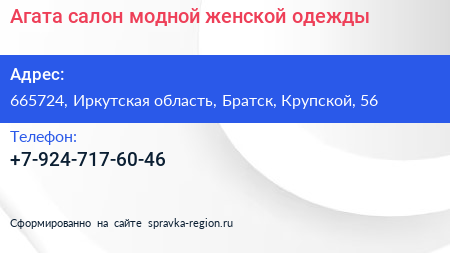 Агата, салон модной женской одежды по адресу 665724, Иркутская область, Братск, Крупской, 56 в дальнейшем Организация, размещена в следующих категориях: