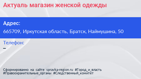 Актуаль, магазин женской одежды по адресу 665709, Иркутская область, Братск, Наймушина, 50 в дальнейшем Организация, размещена в следующих категориях: