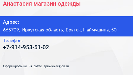 Анастасия, магазин одежды по адресу 665709, Иркутская область, Братск, Наймушина, 50 в дальнейшем Организация, размещена в следующих категориях: