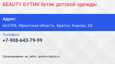 BEAUTY БУТИК, бутик детской одежды по адресу 665708, Иркутская область, Братск, Кирова, 18 в дальнейшем Организация, размещена в следующих категориях: