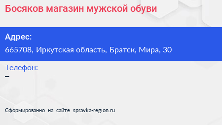 Босяков, магазин мужской обуви по адресу 665708, Иркутская область, Братск, Мира, 30 в дальнейшем Организация, размещена в следующих категориях: