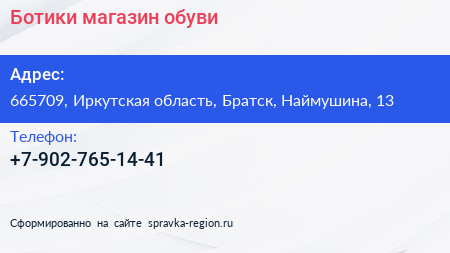 Ботики, магазин обуви по адресу 665709, Иркутская область, Братск, Наймушина, 13 в дальнейшем Организация, размещена в следующих категориях: