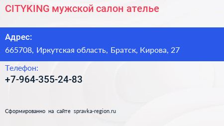 CITYKING, мужской салон-ателье по адресу 665708, Иркутская область, Братск, Кирова, 27 в дальнейшем Организация, размещена в следующих категориях: