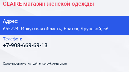 CLAIRE, магазин женской одежды по адресу 665724, Иркутская область, Братск, Крупской, 56 в дальнейшем Организация, размещена в следующих категориях:
