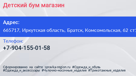 Детский бум, магазин по адресу 665717, Иркутская область, Братск, Комсомольская, 62 ст1 в дальнейшем Организация, размещена в следующих категориях: