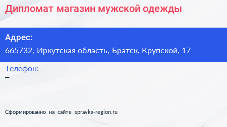 Дипломат, магазин мужской одежды по адресу 665732, Иркутская область, Братск, Крупской, 17 в дальнейшем Организация, размещена в следующих категориях: