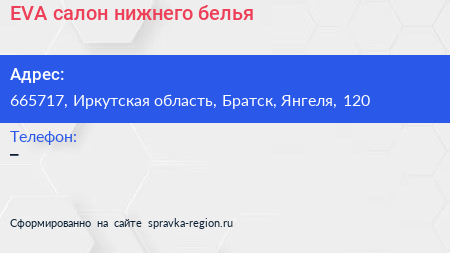 EVA, салон нижнего белья по адресу 665717, Иркутская область, Братск, Янгеля, 120 в дальнейшем Организация, размещена в следующих категориях: