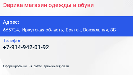 Эврика, магазин одежды и обуви по адресу 665714, Иркутская область, Братск, Вокзальная, 8Б в дальнейшем Организация, размещена в следующих категориях: