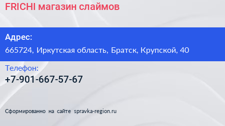 FRICHI, магазин слаймов по адресу 665724, Иркутская область, Братск, Крупской, 40 в дальнейшем Организация, размещена в следующих категориях: