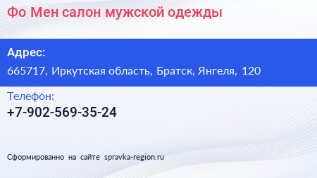 Фо Мен, салон мужской одежды по адресу 665717, Иркутская область, Братск, Янгеля, 120 в дальнейшем Организация, размещена в следующих категориях: