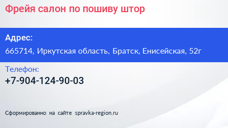 Фрейя, салон по пошиву штор по адресу 665714, Иркутская область, Братск, Енисейская, 52г в дальнейшем Организация, размещена в следующих категориях: