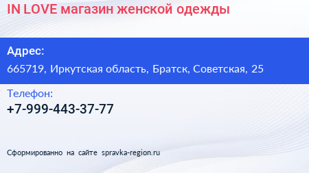 IN LOVE, магазин женской одежды по адресу 665719, Иркутская область, Братск, Советская, 25 в дальнейшем Организация, размещена в следующих категориях: