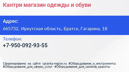 Кантри, магазин одежды и обуви по адресу 665732, Иркутская область, Братск, Гагарина, 18 в дальнейшем Организация, размещена в следующих категориях: