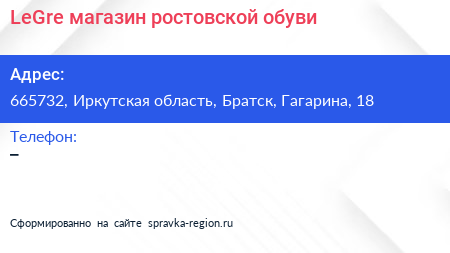 LeGre, магазин ростовской обуви по адресу 665732, Иркутская область, Братск, Гагарина, 18 в дальнейшем Организация, размещена в следующих категориях: