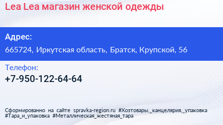 Lea Lea, магазин женской одежды по адресу 665724, Иркутская область, Братск, Крупской, 56 в дальнейшем Организация, размещена в следующих категориях: