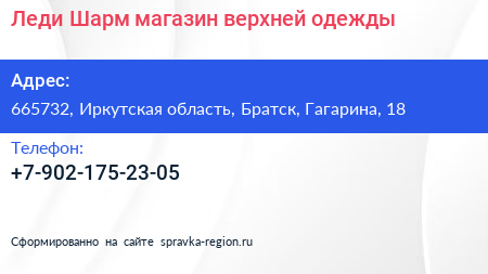 Леди Шарм, магазин верхней одежды по адресу 665732, Иркутская область, Братск, Гагарина, 18 в дальнейшем Организация, размещена в следующих категориях: