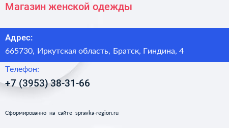 Магазин женской одежды по адресу 665730, Иркутская область, Братск, Гиндина, 4 в дальнейшем Организация, размещена в следующих категориях: