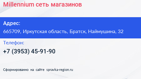Millennium, сеть магазинов по адресу 665709, Иркутская область, Братск, Наймушина, 32 в дальнейшем Организация, размещена в следующих категориях: