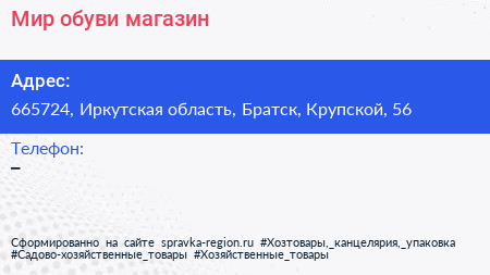 Мир обуви, магазин по адресу 665724, Иркутская область, Братск, Крупской, 56 в дальнейшем Организация, размещена в следующих категориях: