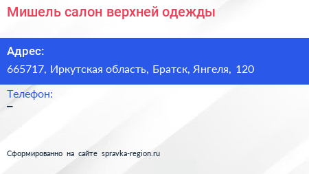 Мишель, салон верхней одежды по адресу 665717, Иркутская область, Братск, Янгеля, 120 в дальнейшем Организация, размещена в следующих категориях: