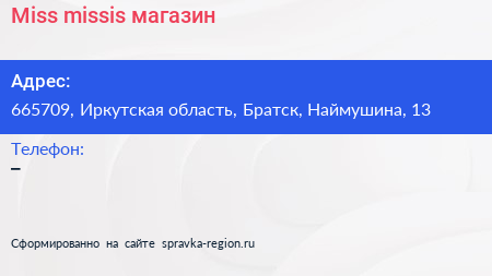 Miss & missis, магазин по адресу 665709, Иркутская область, Братск, Наймушина, 13 в дальнейшем Организация, размещена в следующих категориях: