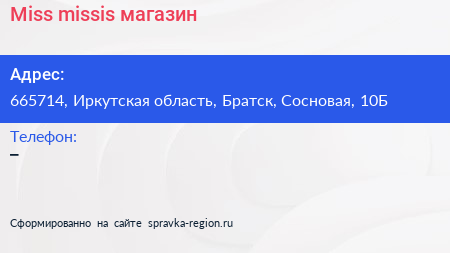 Miss & missis, магазин по адресу 665714, Иркутская область, Братск, Сосновая, 10Б в дальнейшем Организация, размещена в следующих категориях: