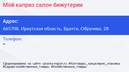 Мой каприз, салон бижутерии по адресу 665708, Иркутская область, Братск, Обручева, 28 в дальнейшем Организация, размещена в следующих категориях: