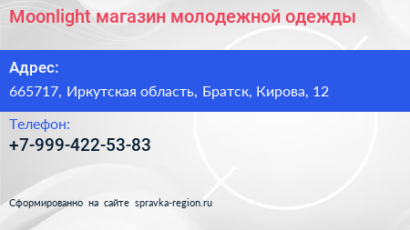 Moonlight, магазин молодежной одежды по адресу 665717, Иркутская область, Братск, Кирова, 12 в дальнейшем Организация, размещена в следующих категориях: