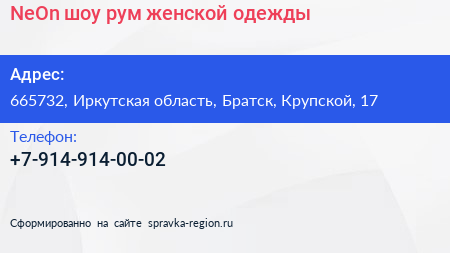 NeOn, шоу-рум женской одежды по адресу 665732, Иркутская область, Братск, Крупской, 17 в дальнейшем Организация, размещена в следующих категориях:
