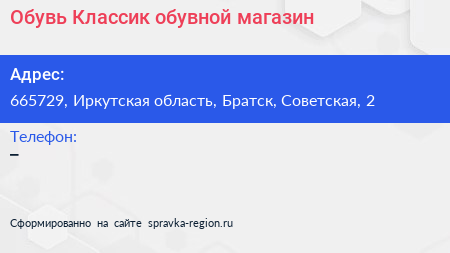 Обувь Классик, обувной магазин по адресу 665729, Иркутская область, Братск, Советская, 2 в дальнейшем Организация, размещена в следующих категориях: