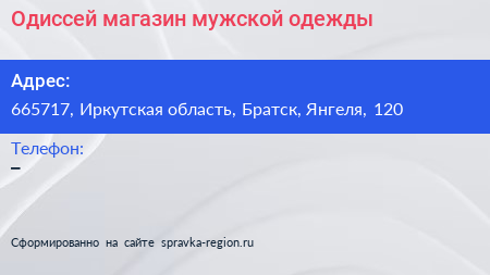 Одиссей, магазин мужской одежды по адресу 665717, Иркутская область, Братск, Янгеля, 120 в дальнейшем Организация, размещена в следующих категориях: