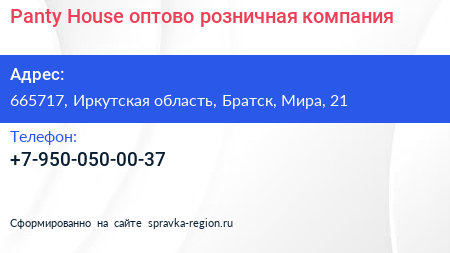 Panty House, оптово-розничная компания по адресу 665717, Иркутская область, Братск, Мира, 21 в дальнейшем Организация, размещена в следующих категориях: