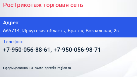 РосТрикотаж, торговая сеть по адресу 665714, Иркутская область, Братск, Вокзальная, 2в в дальнейшем Организация, размещена в следующих категориях: