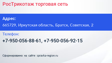 РосТрикотаж, торговая сеть по адресу 665729, Иркутская область, Братск, Советская, 2 в дальнейшем Организация, размещена в следующих категориях: