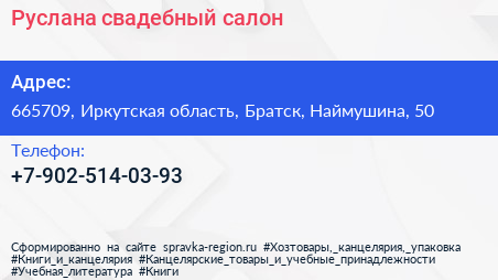 Руслана, свадебный салон по адресу 665709, Иркутская область, Братск, Наймушина, 50 в дальнейшем Организация, размещена в следующих категориях: