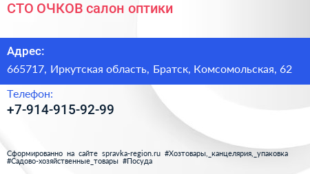 СТО ОЧКОВ, салон оптики по адресу 665717, Иркутская область, Братск, Комсомольская, 62 в дальнейшем Организация, размещена в следующих категориях: