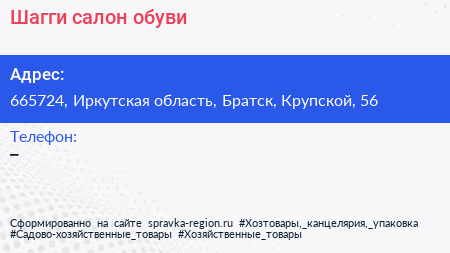 Шагги, салон обуви по адресу 665724, Иркутская область, Братск, Крупской, 56 в дальнейшем Организация, размещена в следующих категориях: