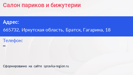 Салон париков и бижутерии по адресу 665732, Иркутская область, Братск, Гагарина, 18 в дальнейшем Организация, размещена в следующих категориях: