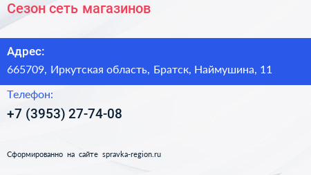 Сезон, сеть магазинов по адресу 665709, Иркутская область, Братск, Наймушина, 11 в дальнейшем Организация, размещена в следующих категориях: