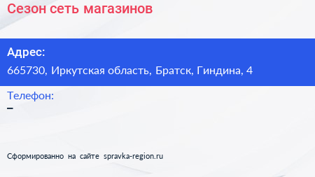 Сезон, сеть магазинов по адресу 665730, Иркутская область, Братск, Гиндина, 4 в дальнейшем Организация, размещена в следующих категориях: