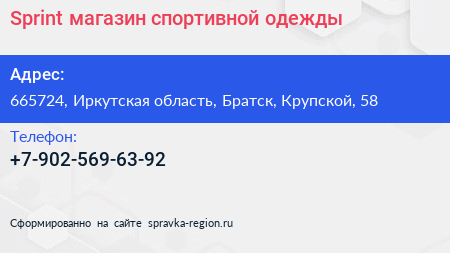 Sprint, магазин спортивной одежды по адресу 665724, Иркутская область, Братск, Крупской, 58 в дальнейшем Организация, размещена в следующих категориях: